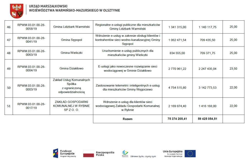 Lista projektów wybranych do dofinansowania opublikowana została pod adresem: https://rpo.warmia.mazury.pl/artykul/5296/dzialanie-31-cyfrowa-dostepnosc-informacji-sektora-publicznego-oraz-wysoka-jakosc-e-uslug-publicznych-konkurs-nr-rpwm030100-iz00-28-00119