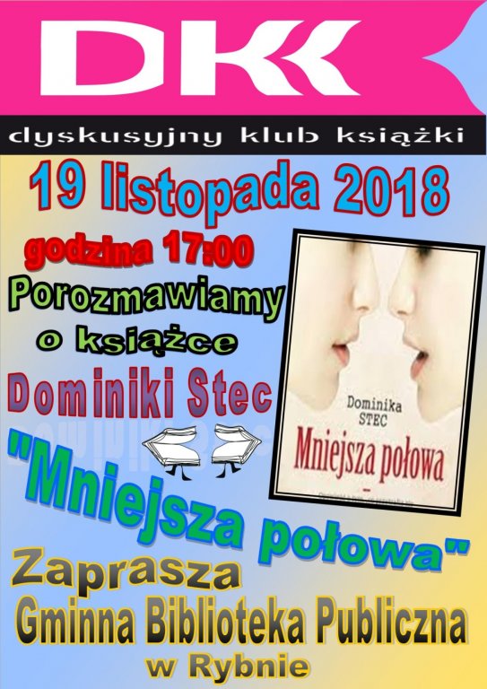 Tematem rozmów będzie książka Dominiki Stec pod tytułem "Mniejsza połowa". Początek spotkania zaplanowano na godzinę 17:00.