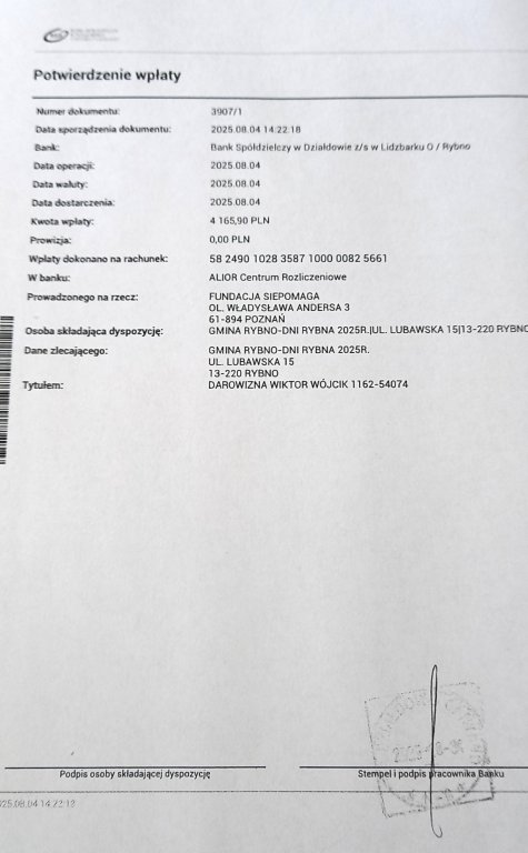 Podczas tegorocznych Dni Rybna prowadziliśmy zbiórkę na rzecz chorego Wiktorka, który potrzebuje kosztownego leczenia i rehabilitacji. Dzięki Waszej ogromnej hojności i zaangażowaniu udało się zebrać 4165,90 zł!