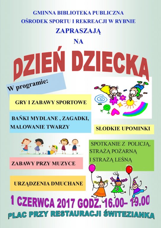 Gminna Biblioteka Publiczna oraz Ośrodek Sportu i Rekreacji w Rybnie zapraszają na Dzień Dziecka.