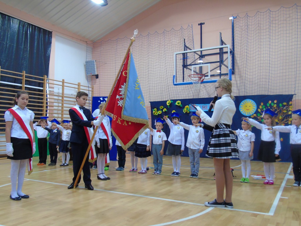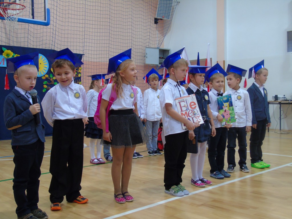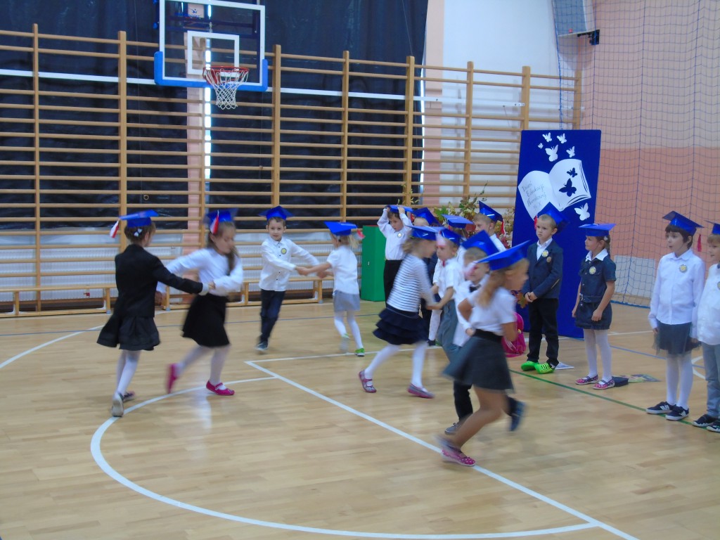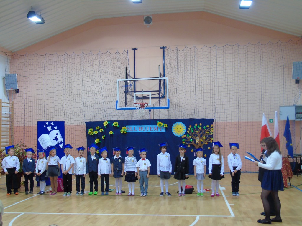 Uroczystość Ślubowania uczniów klasy pierwszej rozpoczęła się od zaprezentowania przez dzieci programu artystycznego przygotowanego specjalnie na tę okazję pod kierunkiem wychowawczyni Bożeny Kamińskiej. Licznie zgromadzeni goście podziwiali uczniów ubranych w stroje galowe i charakterystyczne birety. Każdy pierwszoklasista miał okazję wystąpić przed publicznością i pochwalić się swoimi zdolnościami recytatorskimi, piosenkarskimi oraz tanecznymi. Wszyscy wykonawcy otrzymali gromkie brawa. Najważniejszym punktem było uroczyste ślubowanie pierwszaków na sztandar szkoły. Zgodnie z tradycją wszystkie dzieci musiały wypić sok z cytryny i uśmiechnąć się przed zgromadzoną widownią. Następnie Pani Dyrektor symbolicznym ołówkiem dokonała aktu pasowania na uczniów, a wychowawczyni wręczyła pamiątkowe dyplomy. Na zakończenie uroczystości przedstawiciele klas trzecich powitali pierwszaków w szkolnej rodzinie, życzyli sukcesów w nauce i radości ze zdobywania wiedzy oraz zaoferowali swoją pomoc w razie trudności. Wręczyli młodszym koleżankom i kolegom samodzielnie wykonane upominki.
