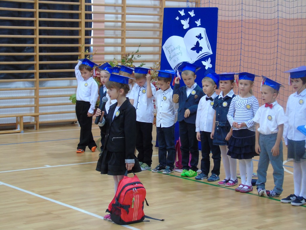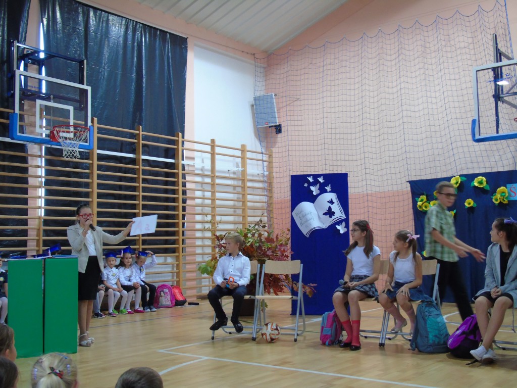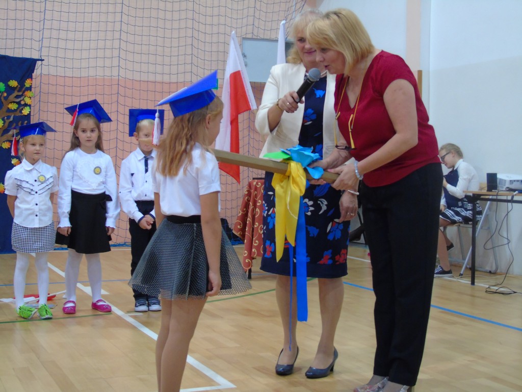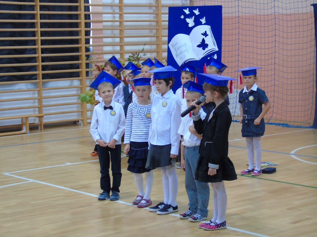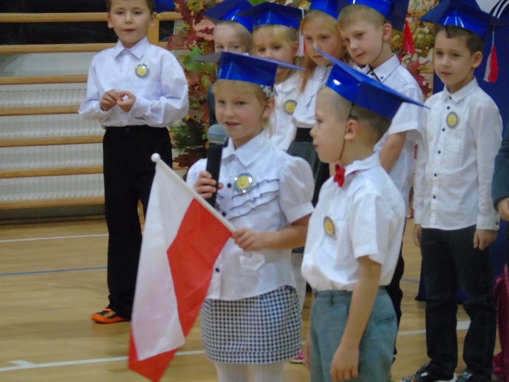 Uroczystość Ślubowania uczniów klasy pierwszej rozpoczęła się od zaprezentowania przez dzieci programu artystycznego przygotowanego specjalnie na tę okazję pod kierunkiem wychowawczyni Bożeny Kamińskiej. Licznie zgromadzeni goście podziwiali uczniów ubranych w stroje galowe i charakterystyczne birety. Każdy pierwszoklasista miał okazję wystąpić przed publicznością i pochwalić się swoimi zdolnościami recytatorskimi, piosenkarskimi oraz tanecznymi. Wszyscy wykonawcy otrzymali gromkie brawa. Najważniejszym punktem było uroczyste ślubowanie pierwszaków na sztandar szkoły. Zgodnie z tradycją wszystkie dzieci musiały wypić sok z cytryny i uśmiechnąć się przed zgromadzoną widownią. Następnie Pani Dyrektor symbolicznym ołówkiem dokonała aktu pasowania na uczniów, a wychowawczyni wręczyła pamiątkowe dyplomy. Na zakończenie uroczystości przedstawiciele klas trzecich powitali pierwszaków w szkolnej rodzinie, życzyli sukcesów w nauce i radości ze zdobywania wiedzy oraz zaoferowali swoją pomoc w razie trudności. Wręczyli młodszym koleżankom i kolegom samodzielnie wykonane upominki.