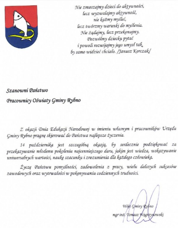 Z okazji Dnia Edukacji Narodowej w imieniu własnym i pracowników Urzędu Gminy Rybno pragnę skierować do Państwa najlepsze życzenia.