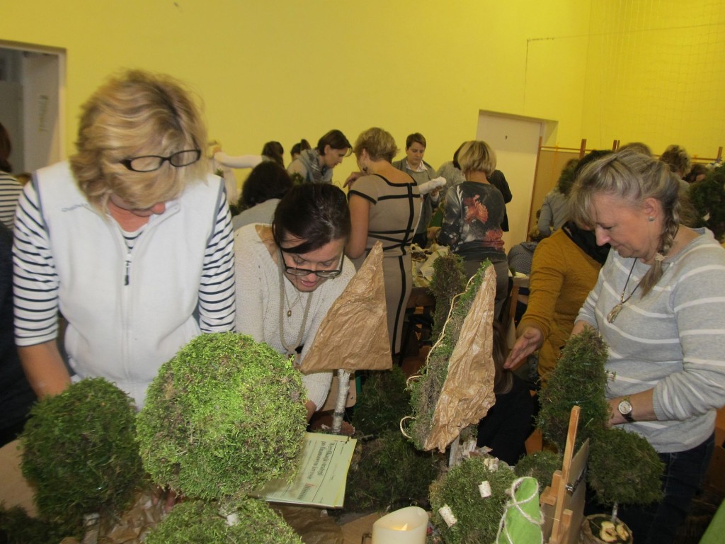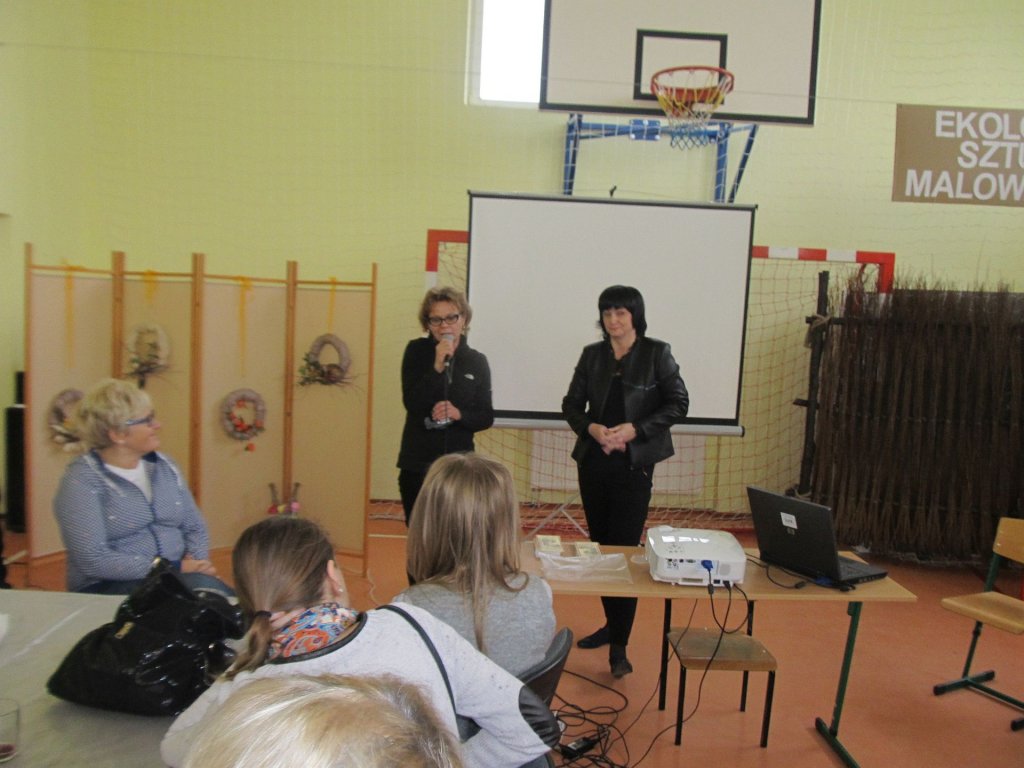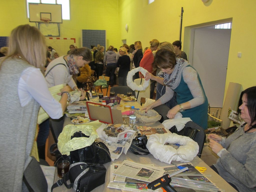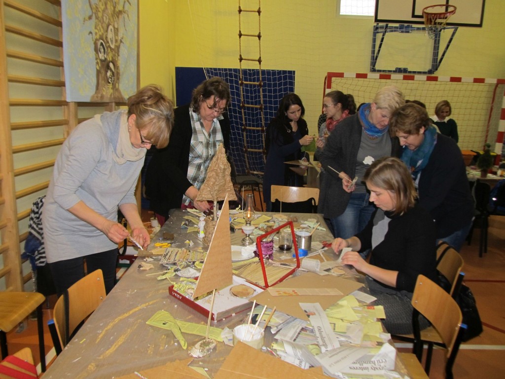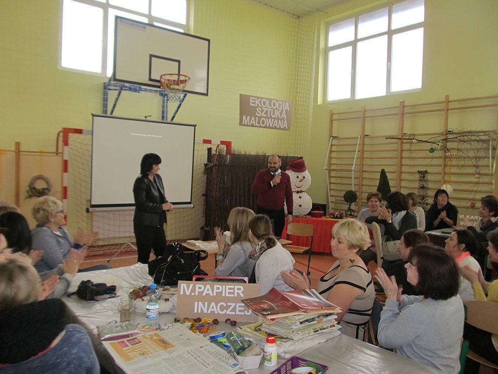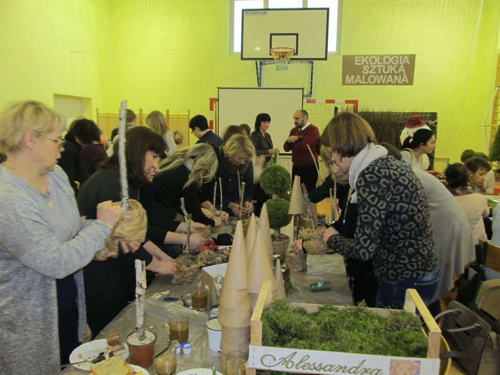 21 listopada 2015r. odbył się warsztat pod hasłem: ”Ekologiczna sztuką malowana”. W rolę instruktorów wcielili się nauczyciele, pracownicy szkoły, a także sołtys wsi pani Elżbieta Rozentalska. Sala gimnastyczna zamieniła się w miejsce twórczych działań. Na sześciu stanowiskach zostały przygotowane materiały do pracy. Na pierwszym stanowisku „Mchowe opowieści…” uczestniczki mogły wykonać z mchu, gałązek- ekologiczne ozdoby. Należy podkreślić, iż uczestniczki bardzo zainspirował mech i materiały przyrodnicze. Powstały przepiękne, niepowtarzalne dzieła sztuki. Ze starych gazet robiły wiklinę papierową, którą ozdabiano kartonowe, trójkątne formy. W ten sposób powstawały ekologiczne choinki. Papier wykorzystano także do formowania wianków, które następnie oplatano kawałkami materiału. Ze zwykłej rolki po papierze toaletowym uczestniczki wykonywały opakowania na prezenty, kalendarze adwentowe. O tym, iż kawałki starych chustek, koszul w połączeniu z kasztanami, orzechami tworzą piękną ekologiczną biżuterię przekonały się nauczycielki na stoisku: „Tkanina inaczej…”. Samodzielnie wykonane korale, bransoletki mogą stać się upominkiem dla najbliższej osoby. Z pasków gąbki powstawały przepiękne kwiaty, które mogą być wykonane już przez dzieci przedszkolne.