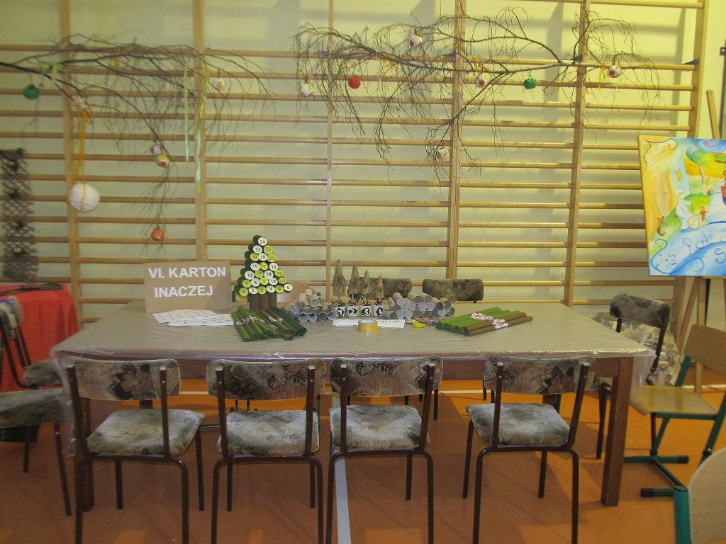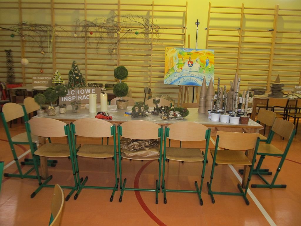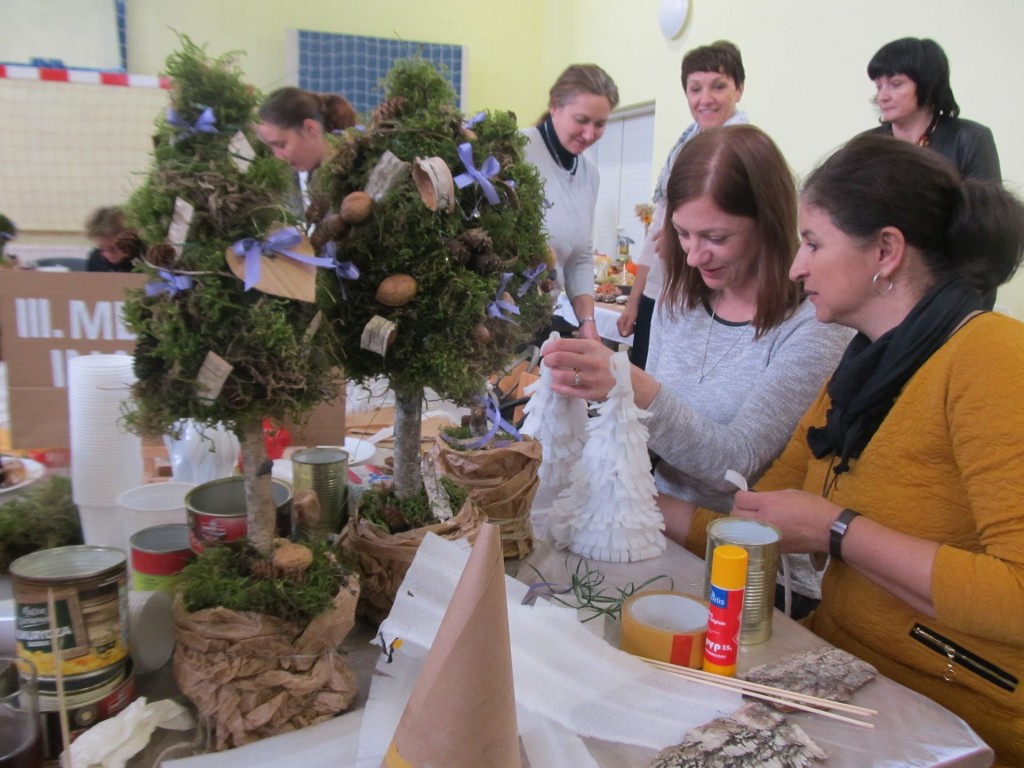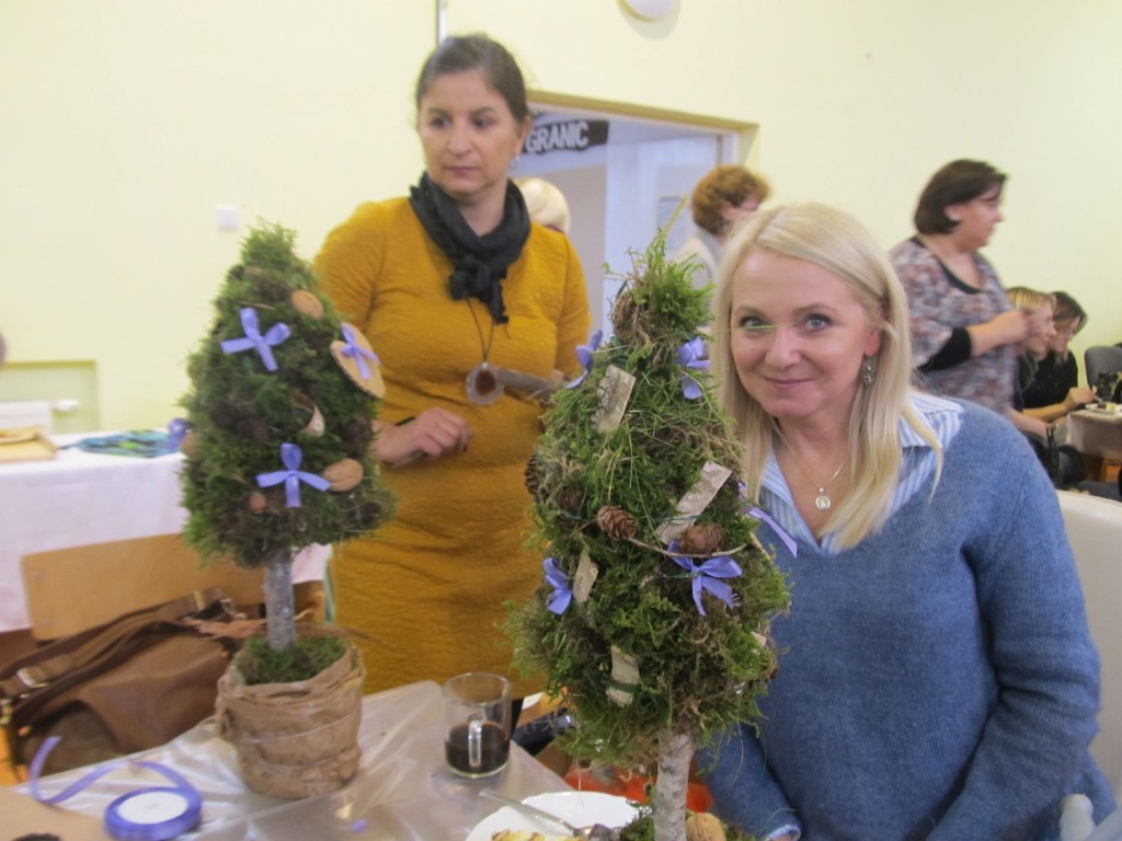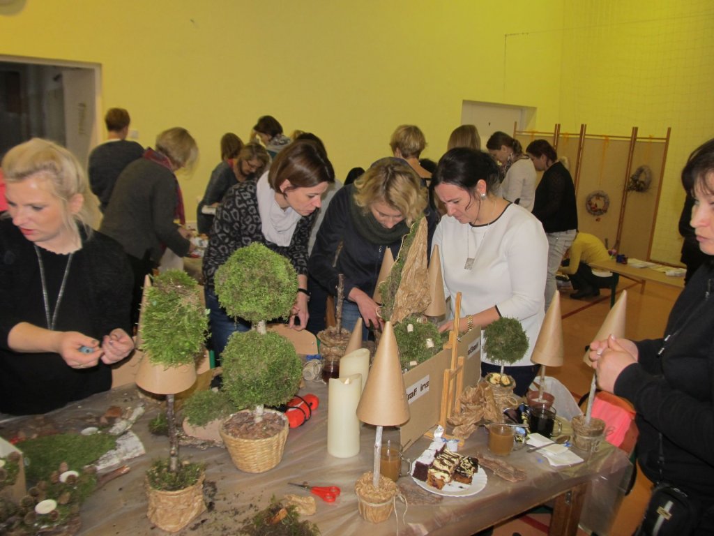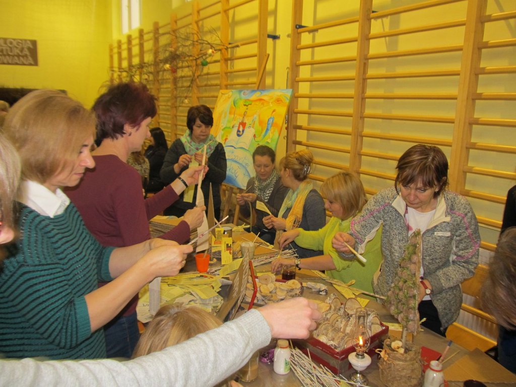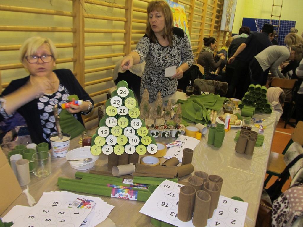 21 listopada 2015r. odbył się warsztat pod hasłem: ”Ekologiczna sztuką malowana”. W rolę instruktorów wcielili się nauczyciele, pracownicy szkoły, a także sołtys wsi pani Elżbieta Rozentalska. Sala gimnastyczna zamieniła się w miejsce twórczych działań. Na sześciu stanowiskach zostały przygotowane materiały do pracy. Na pierwszym stanowisku „Mchowe opowieści…” uczestniczki mogły wykonać z mchu, gałązek- ekologiczne ozdoby. Należy podkreślić, iż uczestniczki bardzo zainspirował mech i materiały przyrodnicze. Powstały przepiękne, niepowtarzalne dzieła sztuki. Ze starych gazet robiły wiklinę papierową, którą ozdabiano kartonowe, trójkątne formy. W ten sposób powstawały ekologiczne choinki. Papier wykorzystano także do formowania wianków, które następnie oplatano kawałkami materiału. Ze zwykłej rolki po papierze toaletowym uczestniczki wykonywały opakowania na prezenty, kalendarze adwentowe. O tym, iż kawałki starych chustek, koszul w połączeniu z kasztanami, orzechami tworzą piękną ekologiczną biżuterię przekonały się nauczycielki na stoisku: „Tkanina inaczej…”. Samodzielnie wykonane korale, bransoletki mogą stać się upominkiem dla najbliższej osoby. Z pasków gąbki powstawały przepiękne kwiaty, które mogą być wykonane już przez dzieci przedszkolne.