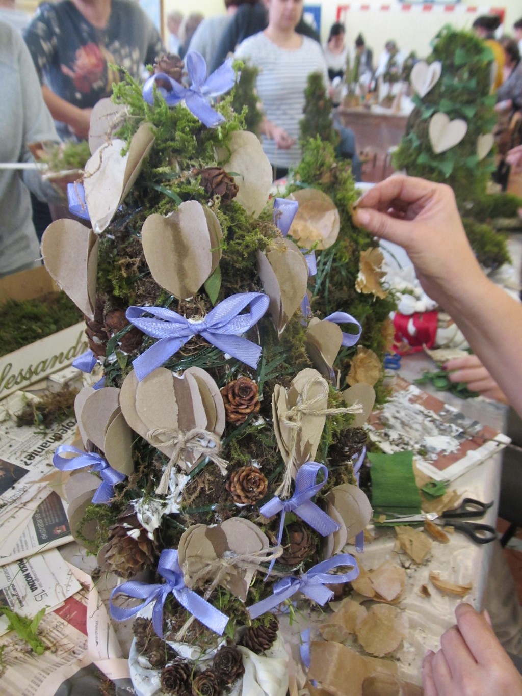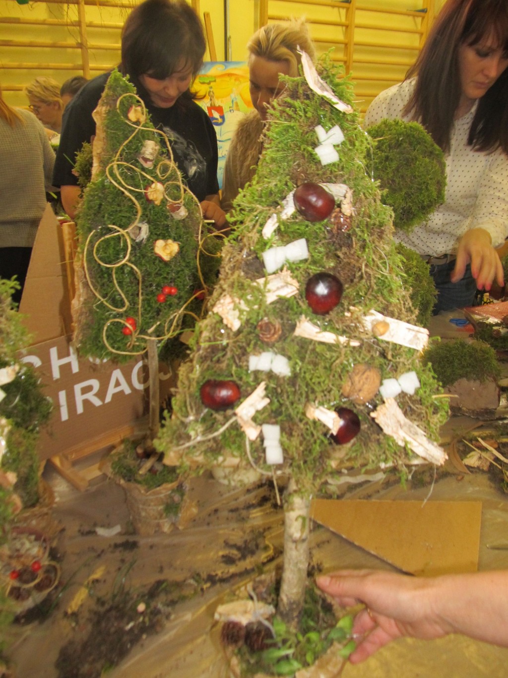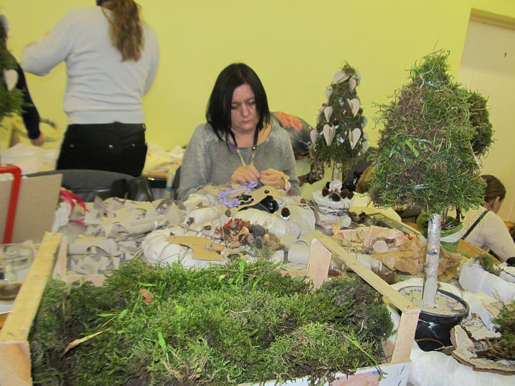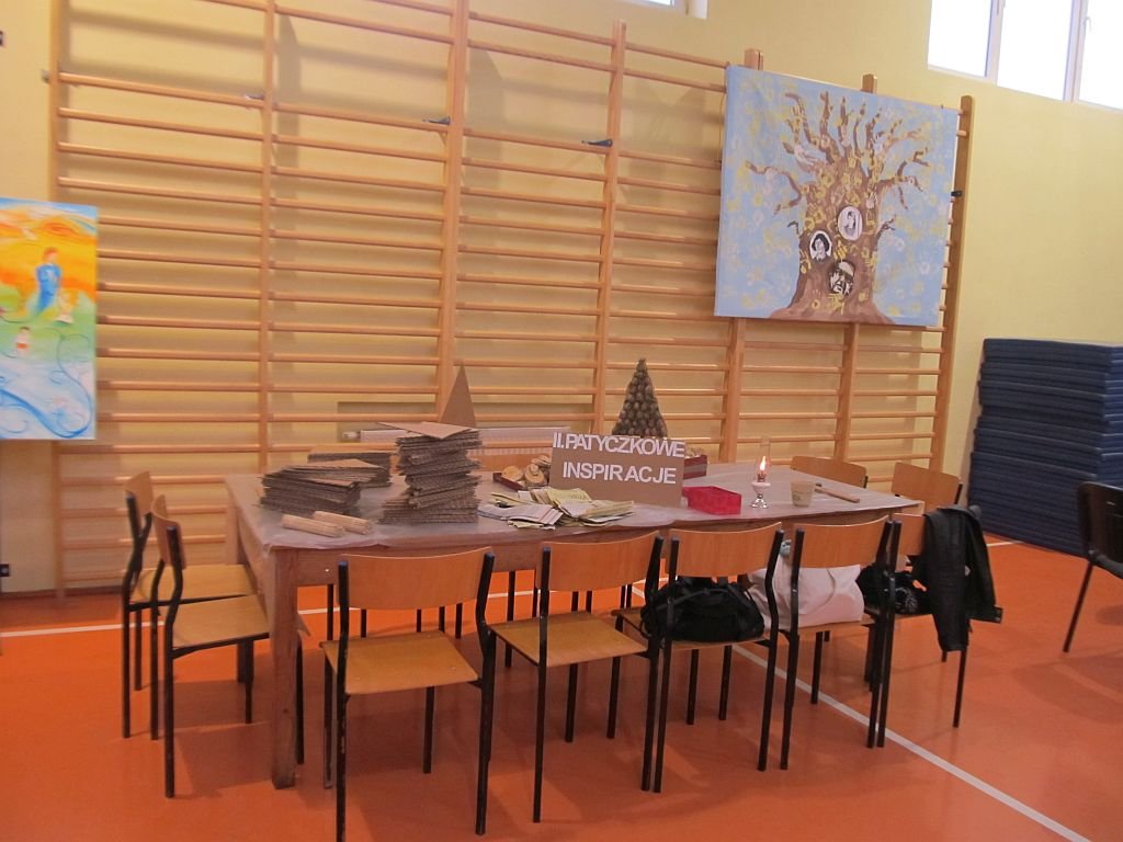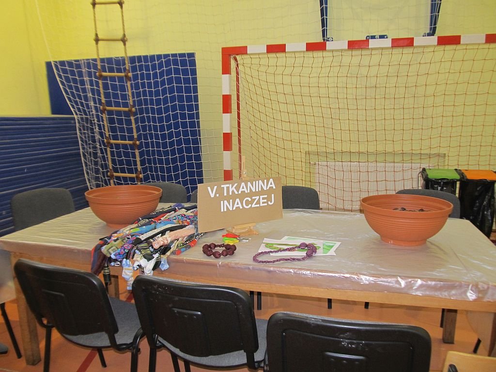 21 listopada 2015r. odbył się warsztat pod hasłem: ”Ekologiczna sztuką malowana”. W rolę instruktorów wcielili się nauczyciele, pracownicy szkoły, a także sołtys wsi pani Elżbieta Rozentalska. Sala gimnastyczna zamieniła się w miejsce twórczych działań. Na sześciu stanowiskach zostały przygotowane materiały do pracy. Na pierwszym stanowisku „Mchowe opowieści…” uczestniczki mogły wykonać z mchu, gałązek- ekologiczne ozdoby. Należy podkreślić, iż uczestniczki bardzo zainspirował mech i materiały przyrodnicze. Powstały przepiękne, niepowtarzalne dzieła sztuki. Ze starych gazet robiły wiklinę papierową, którą ozdabiano kartonowe, trójkątne formy. W ten sposób powstawały ekologiczne choinki. Papier wykorzystano także do formowania wianków, które następnie oplatano kawałkami materiału. Ze zwykłej rolki po papierze toaletowym uczestniczki wykonywały opakowania na prezenty, kalendarze adwentowe. O tym, iż kawałki starych chustek, koszul w połączeniu z kasztanami, orzechami tworzą piękną ekologiczną biżuterię przekonały się nauczycielki na stoisku: „Tkanina inaczej…”. Samodzielnie wykonane korale, bransoletki mogą stać się upominkiem dla najbliższej osoby. Z pasków gąbki powstawały przepiękne kwiaty, które mogą być wykonane już przez dzieci przedszkolne.