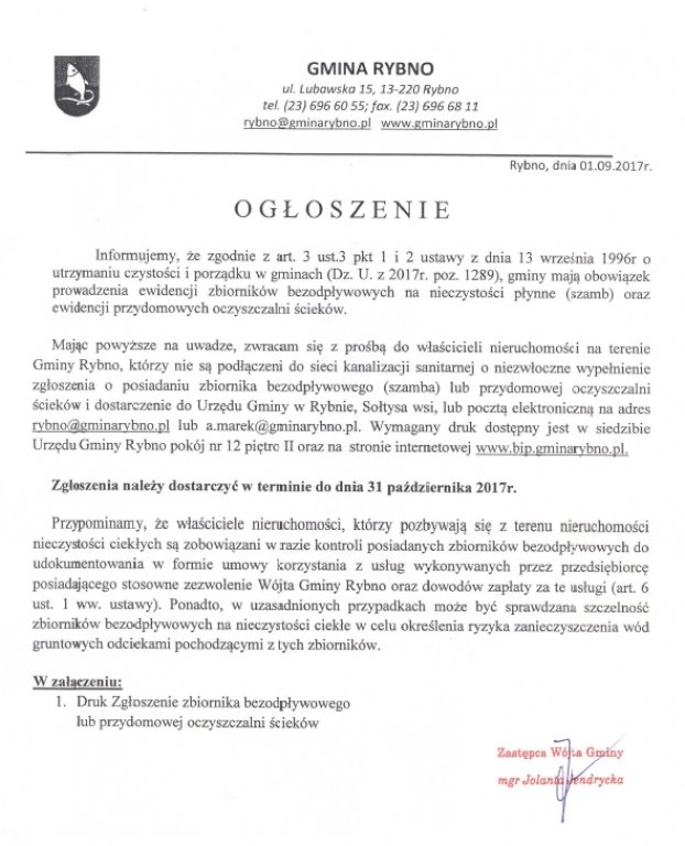 Mając powyższe na uwadze, zwracam się z prośbą do właścicieli nieruchomości na terenie Gminy Rybno, którzy nie są podłączeni do sieci kanalizacji sanitarnej o niezwłoczne wypełnienie zgłoszenia o posiadaniu zbiornika bezodpływowego (szamba) lub przydomowej oczyszczalni ścieków i dostarczenie do Urzędu Gminy w Rybnie, Sołtysa wsi, lub pocztą elektroniczną na adres rybno@gminarybno.pl lub a.marek@gminarybno.pl. Wymagany druk dostępny jest w siedzibie Urzędu Gminy Rybno pokój nr 12 piętro II oraz na stronie internetowej www.bip.gminarybno.pl.