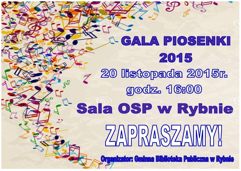 Organizatorem "Gali Piosenki 2015" jest Gminna Biblioteka Publiczna w Rybnie. Konkurs wokalny odbędzie się w dniu 20 listopada w sali Ochotniczej Straży Pożarnej w Rybnie. Początek imprezy o godzinie 16:00.