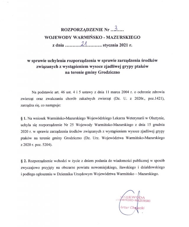 - Rozporządzenie Nr 3 Wojewody Warmińsko-Mazurskiego z dnia 21 stycznia 2021r. w sprawie uchylenia rozporządzenia w sprawie zarządzenia środków związanych z wystąpieniem wysoce zjadliwej grypy ptaków na terenie gminy Grodziczno