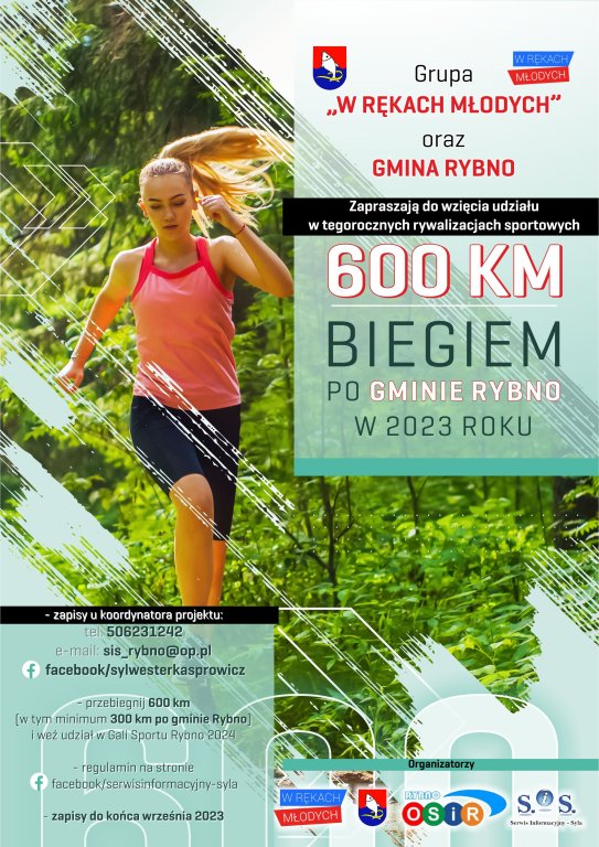 Grupa „W Rękach Młodych”, Gmina Rybno oraz Ośrodek Sportu i Rekreacji w Rybnie zapraszają do wzięcia udziału w tegorocznej edycji rywalizacji 600 km biegiem po gminie Rybno w 2023 roku. To wydarzenie sportowe organizowane dla amatorów biegania, którzy chcą zadbać o swoje zdrowie, kondycję, a także spróbować swoich sił w przebiegnięciu 600 km w tym roku. Zachęcamy wszystkich do wzięcia udziału w rywalizacji.