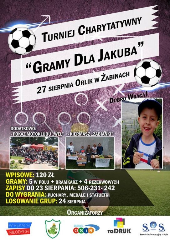 W niedzielę, 27 sierpnia o godz. 13:00 na orliku w Żabinach odbędzie się turniej charytatywny w piłkę nożną - „GRAMY DLA JAKUBA”. Serdecznie zapraszamy do wzięcia udziału w turnieju.