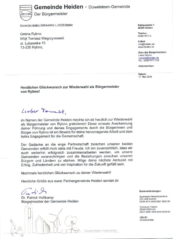 W imieniu gminy Heiden chciałbym Ci serdecznie pogratulować ponownego wyboru na Wójta Gminy Rybno! To ponowne uznanie przez mieszkańców Rybna dla Twojego przewodnictwa i zaangażowania jest dowodem na Twoją wyróżniającą się pracę i Twoje ogromne zaangażowanie dla społeczeństwa.