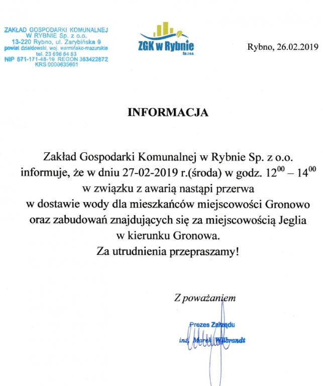Jak informuje Zakład Gospodarki Komunalnej w Rybnie sp. z o. o. w dniu 27 lutego 2019r. (środa) w związku z awarią nastąpi przerwa w dostawie wody dla mieszkańców miejscowości Gronowo oraz zabudowań znajdujących się za miejscowością Jeglia w kierunku Gronowa.