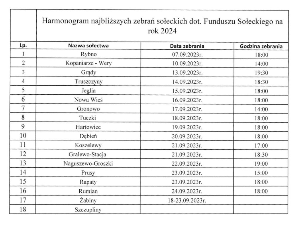 Harmonogram zebrań dotyczących Funduszu Sołeckiego na 2024 rok.