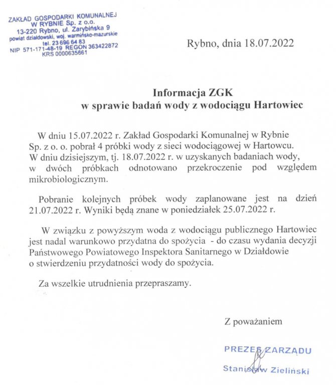 Pobranie kolejnych próbek wody zaplanowane jest na dzień 21.07.2022 r. Wyniki będą znane w poniedziałek 25.07.2022 r. W związku z powyższym woda z wodociągu publicznego Hartowiec jest nadal warunkowo przydatna do spożycia - do czasu wydania decyzji Państwowego Powiatowego Inspektora Sanitarnego w Działdowie o stwierdzeniu przydatności wody do spożycia.