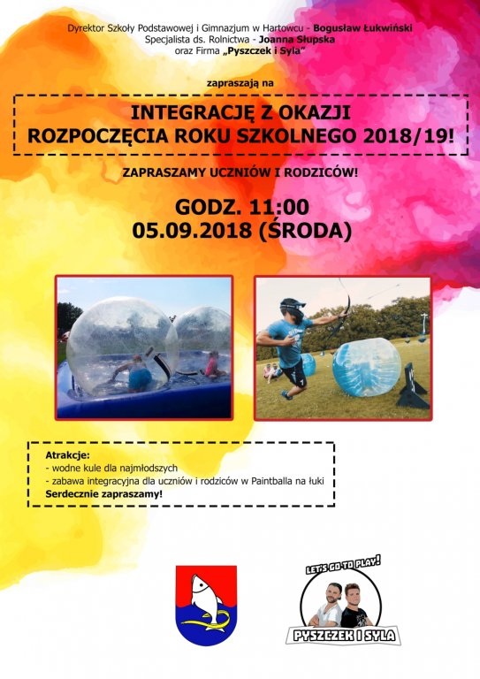 Dyrektor Szkoły Podstawowej i Gimnazjum w Hartowcu – Bogusław Łukwiński, Specjalista ds. Rolnictwa – Joanna Słupska oraz Firma „Pyszczek i Syla” zapraszają w środę, 5 września 2018r. o godz. 11:00 na integrację z okazji rozpoczęcia roku szkolnego 2018/19! Zapraszamy uczniów i rodziców.