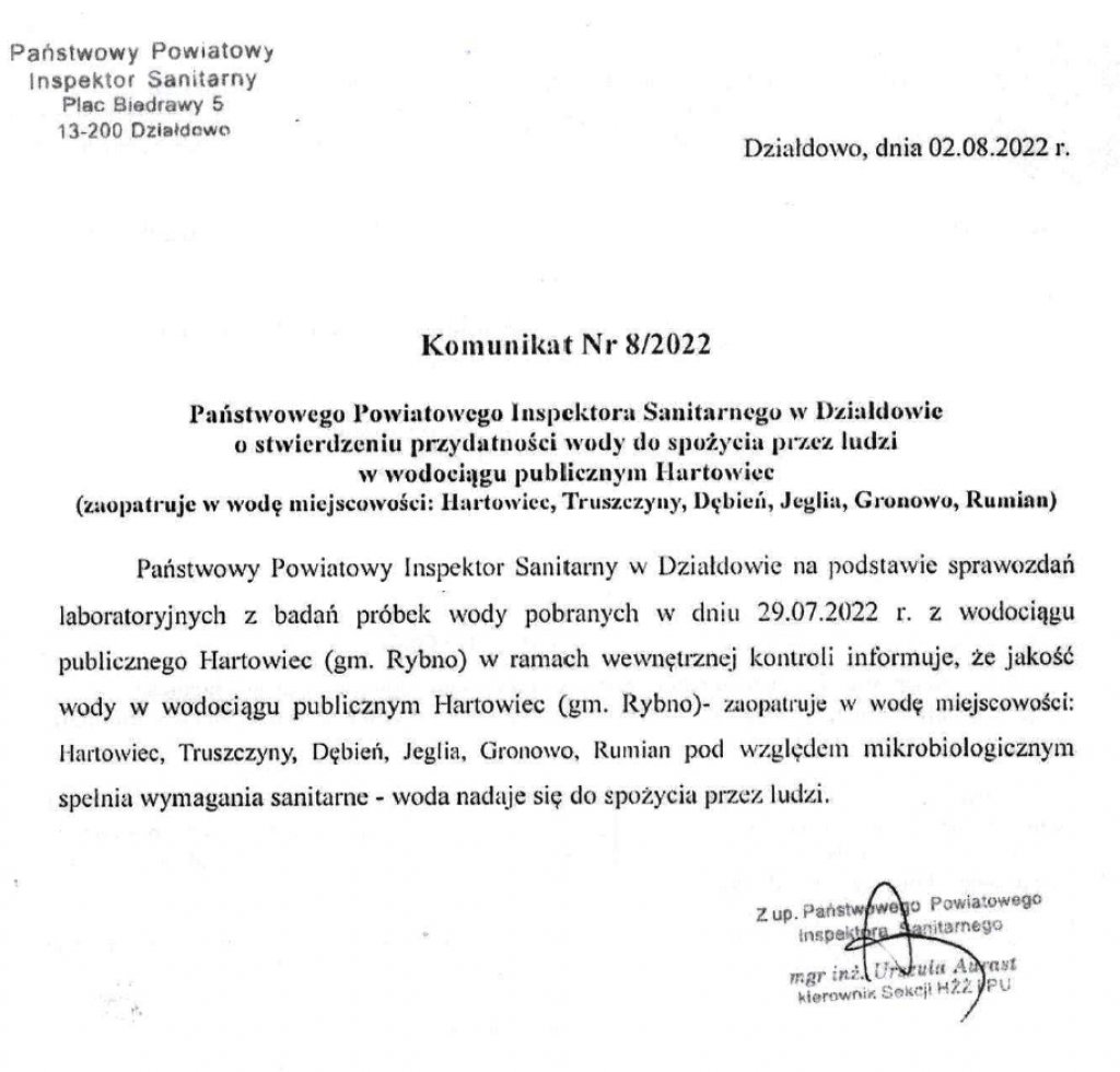 Komunikat Nr 8/2022 Państwowego Powiatowego Inspektora Sanitarnego w Dzialdowie o stwierdzeniu przydatności wody do spożycia przez ludzi w wodociągu publicznym Hartowiec.