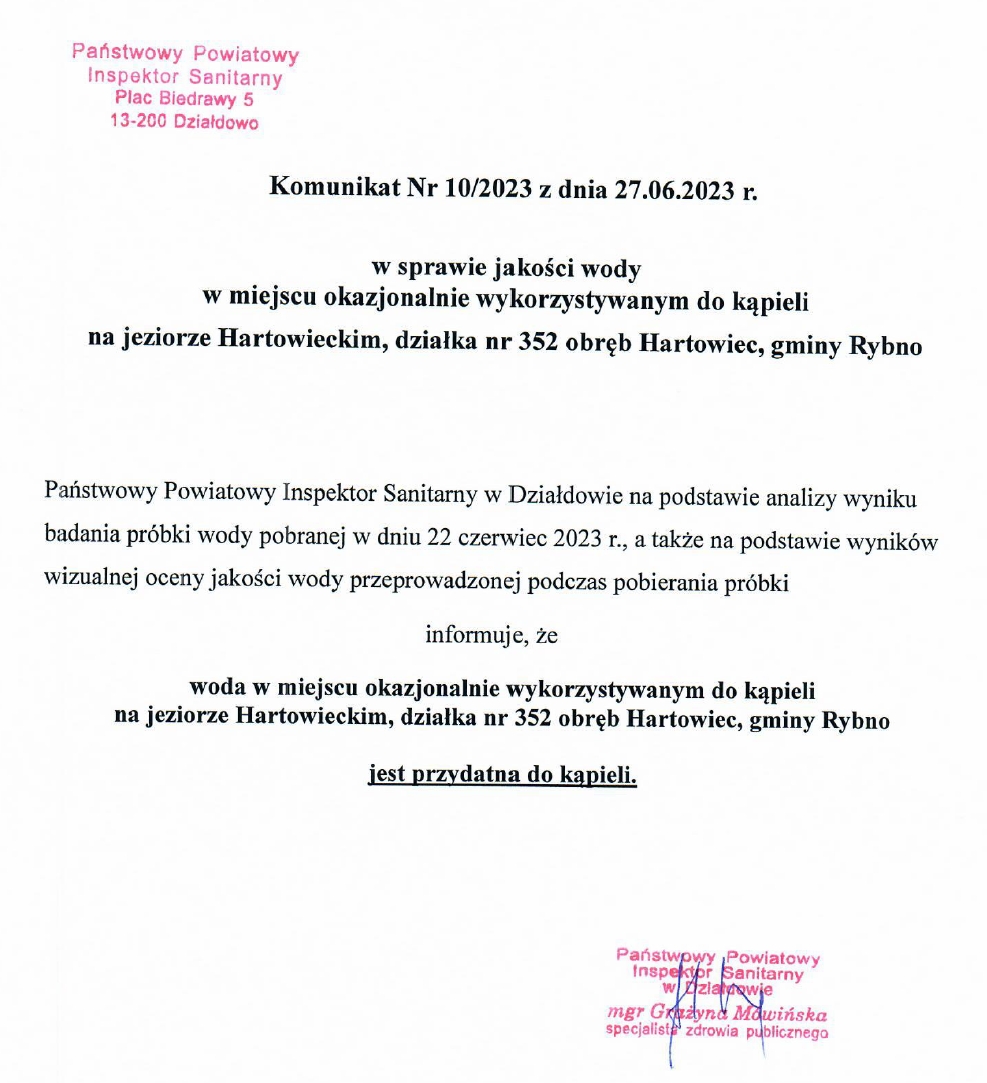 Państwowy Powiatowy Inspektor Sanitarny w Działdowie dokonał bieżącej oceny jakości wody w miejscu okazjonalnie wykorzystywanym do kąpieli na jeziorze Hartowieckim.