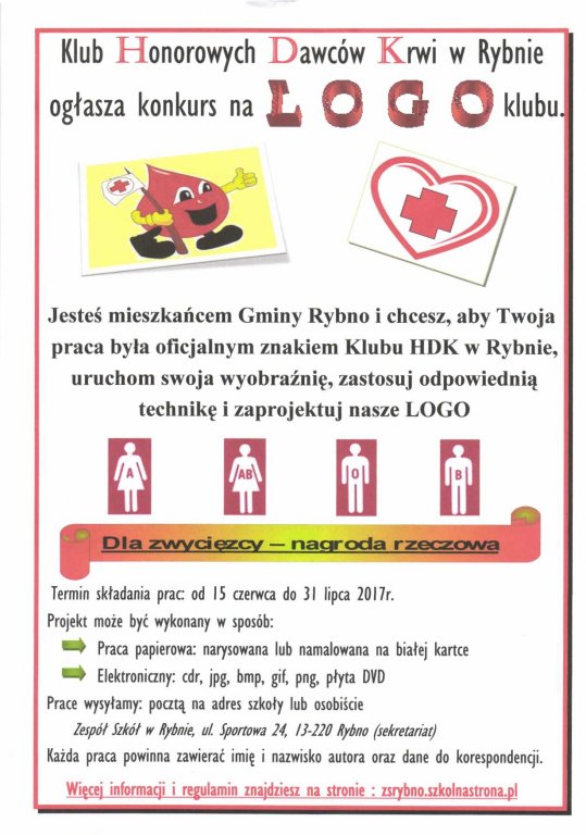 Klub Honorowych Dawców Krwi w Rybnie ogłasza konkurs na logo.