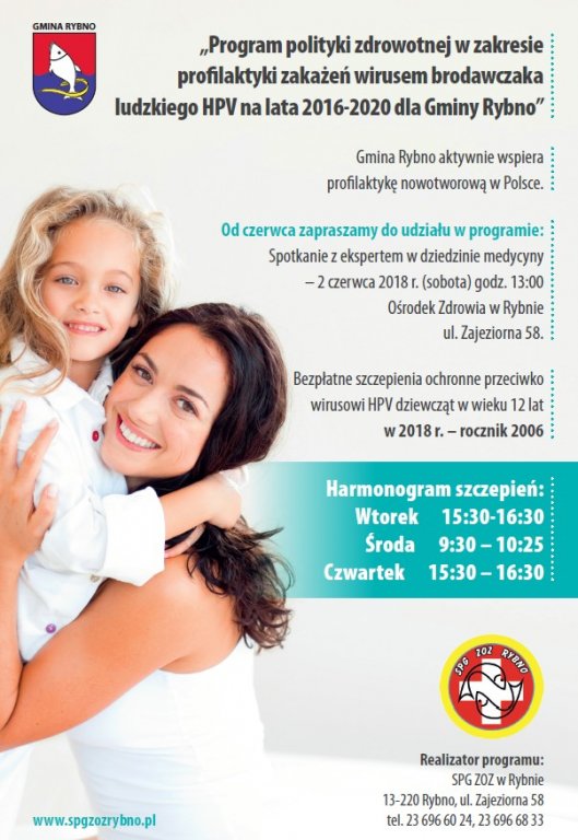 Samodzielny Publiczny Gminny Zakład Opieki Zdrowotnej w Rybnie zaprasza do udziału w „Programie polityki zdrowotnej w zakresie profilaktyki zakażeń wirusem brodawczaka ludzkiego HPV na lata 2016-2020 dla Gminy Rybno”.