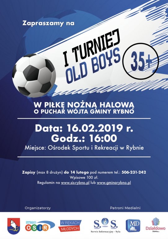 W sobotę, 16 lutego 2019 roku o godz. 16:00 w hali Ośrodka Sportu i Rekreacji w Rybnie odbędzie się I Turniej Old Boys 35+ w Piłkę Nożną Halową o Puchar Wójta Gminy Rybno – Tomasza Węgrzynowskiego.