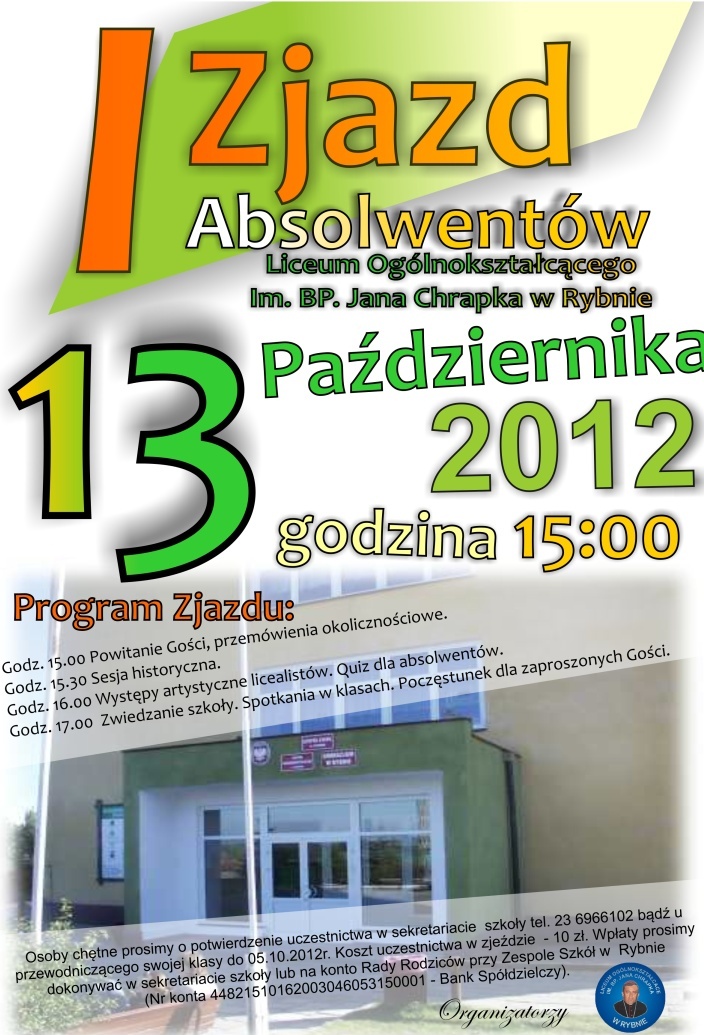 Osoby chętne prosimy o potwierdzenie uczestnictwa w sekretariacie szkoły tel. 23 6966102 bądź u przewodniczącego swojej klasy do 05.10.2012r. Koszt uczestnictwa w zjeździe - 10 zł. Wpłaty prosimy dokonywać w sekretariacie szkoły lub na konto Rady Rodziców przy Zespole Szkół w Rybnie Nr konta 44821510162003046053150001 – Bank Spółdzielczy