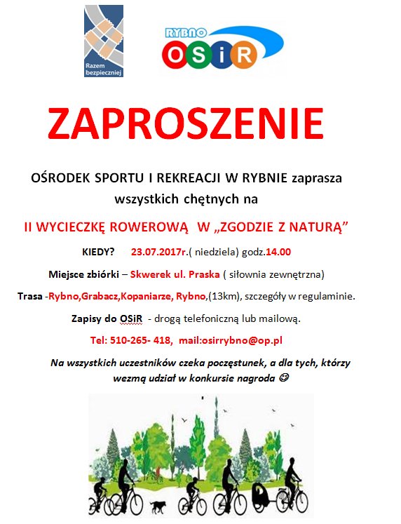 Ośrodek Sportu I Rekreacji w Rybnie zaprasza wszystkich chętnych na ii wycieczkę rowerową w „zgodzie z naturą”.