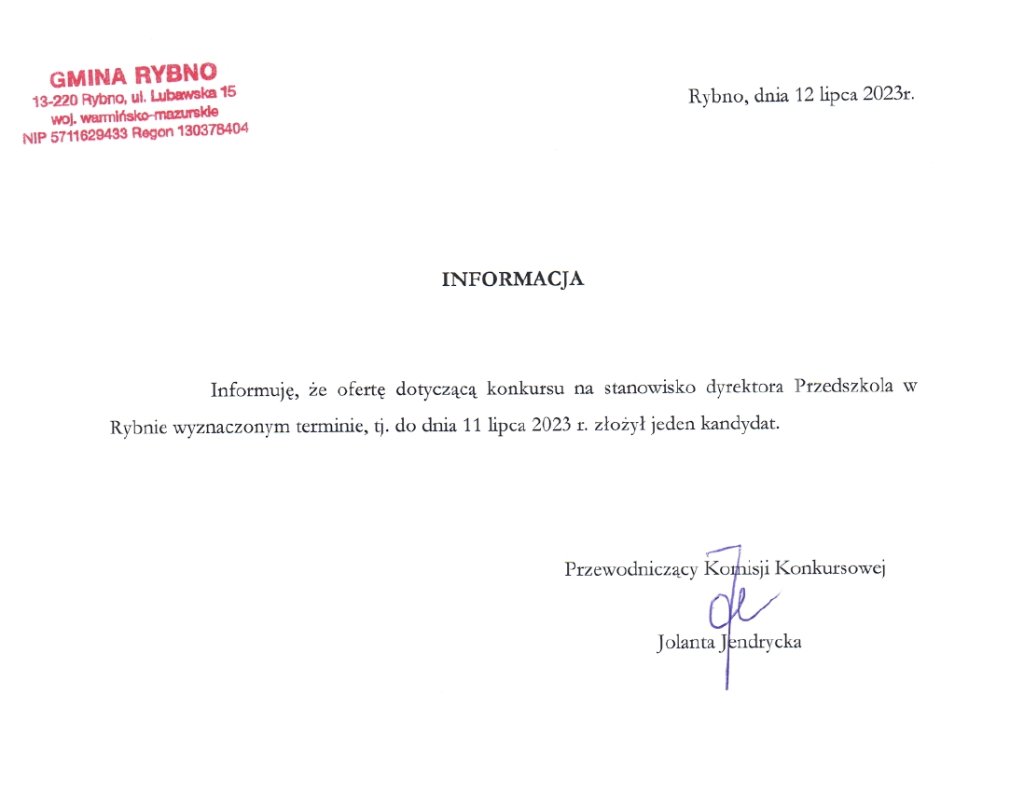 Informacja dotycząca konkursu na stanowisko Dyrektora Przedszkola w Rybnie.