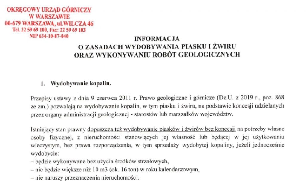 Informacja o zasadach wydobywania piasku i żwiru oraz wykonywania robót geologicznych