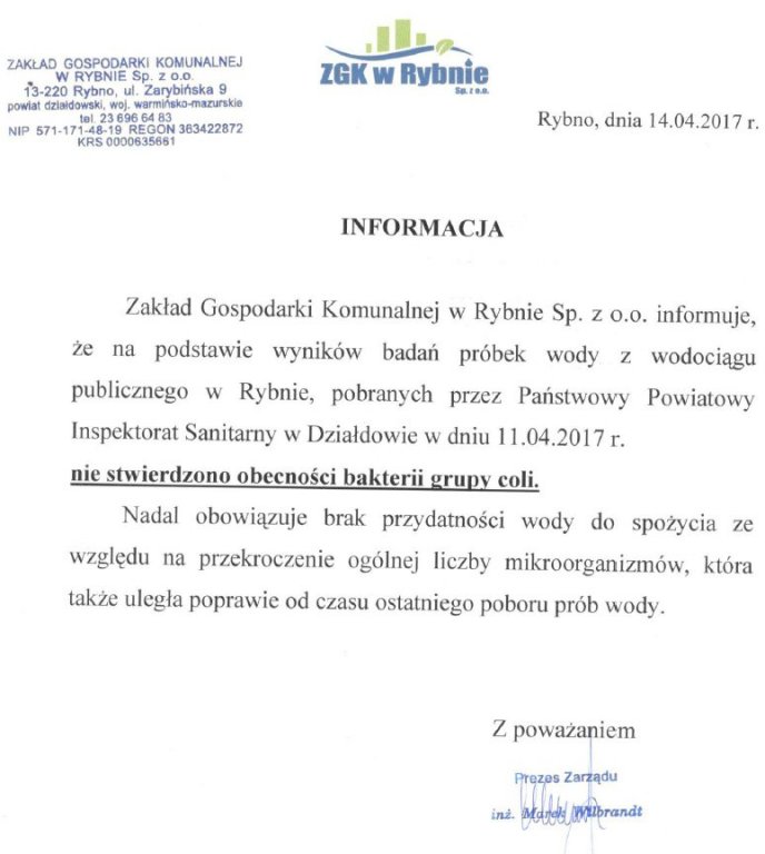 Zakład Gospodarki Komunalnej w Rybnie sp. z o. o. informuje, że na podstawie wyników badań próbek wody z wodociągu publicznego w Rybnie, pobranych przez Państwowy Powiatowy Inspektorat Sanitarny w Działdowie w dniu 11.04.2017r. nie stwierdzono obecności bakterii grupy coli.