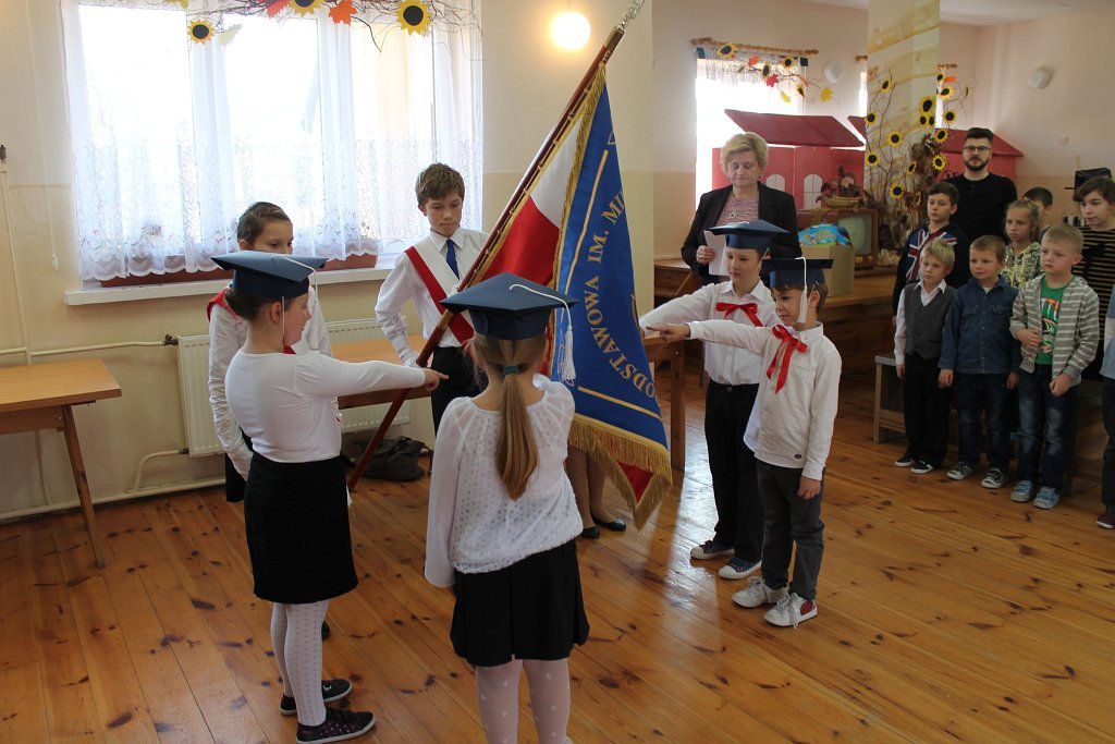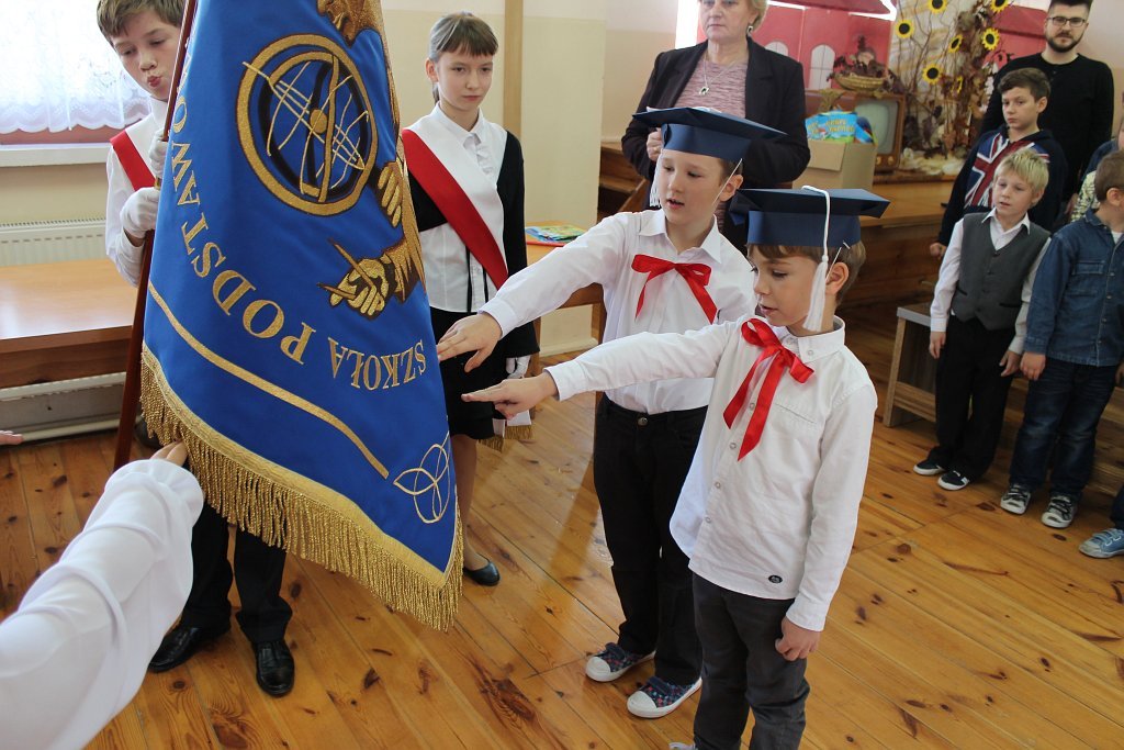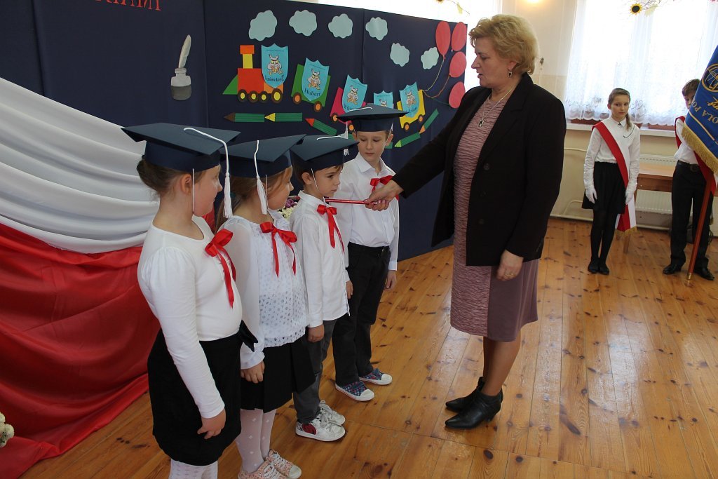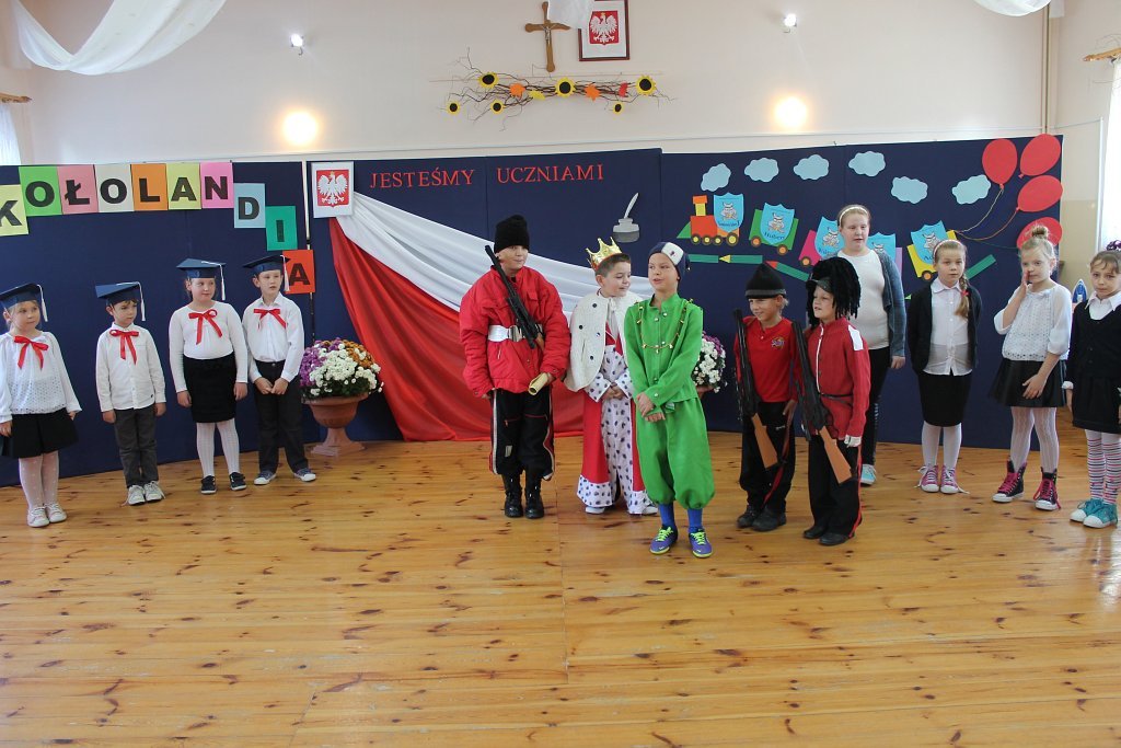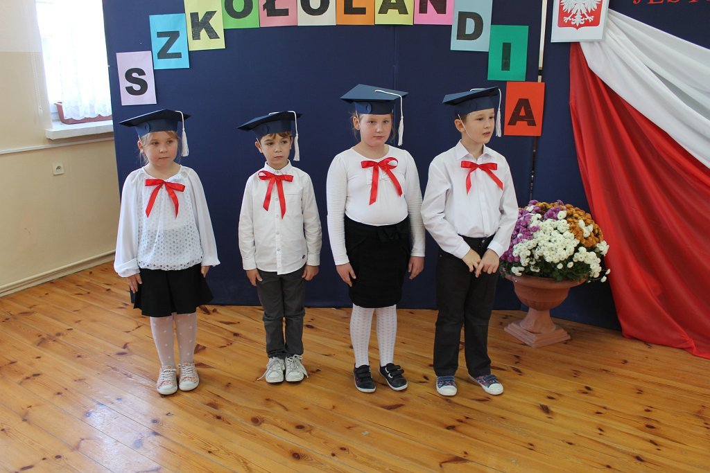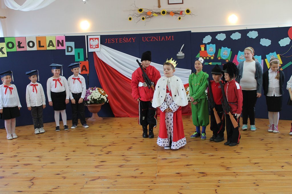 Po odbyciu krótkiego egzaminu poprowadzonego przez Króla „Szkołolandii” dzieci z klasy I złożyły ślubowanie i zostały pasowane przez Panią dyrektor Lucynę Nowakowską na ucznia szkoły podstawowej.
