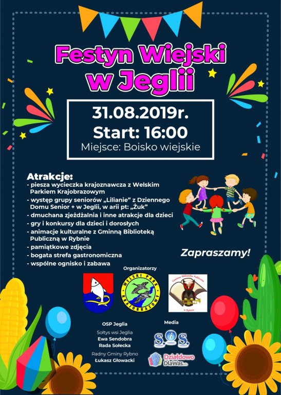 Zapraszamy na festyn w miejscowości Jeglia, który odbędzie się w sobotę 31 sierpnia 2019r.