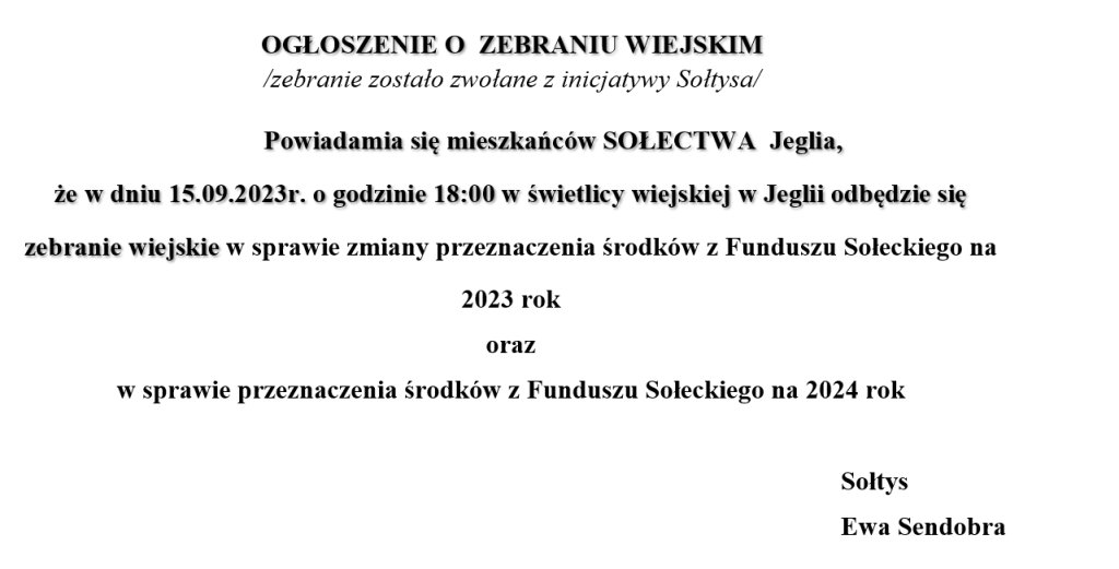 Powiadamia się mieszkańców SOŁECTWA Jeglia, że w dniu 15.09.2023r. o godzinie 18:00 w świetlicy wiejskiej w Jeglii odbędzie się zebranie wiejskie w sprawie zmiany przeznaczenia środków z Funduszu Sołeckiego na 2023 rok oraz w sprawie przeznaczenia środków z Funduszu Sołeckiego na 2024 rok.