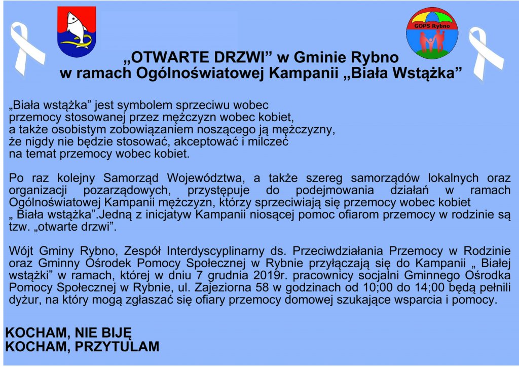 Ir-Wójt Gminy Rybno, Zespół Interdyscyplinarny ds. Przeciwdziałania Przemocy w Rodzinie i-oraz Gminny Ośrodek Pomocy Społecznej w Rybnie przyłączają się do Kampanii „ Białej wstążki" w ramach, której w dniu 7 grudnia 2019r. pracownicy socjalni Gminnego Ośrodka Pomocy Społecznej w Rybnie, ul. Zajeziorna 58 w godzinach od 10:00 do 14:00 będą pełnili dyżur, na który mogą zgłaszać się ofiary przemocy domowej szukające wsparcia i pomocy.