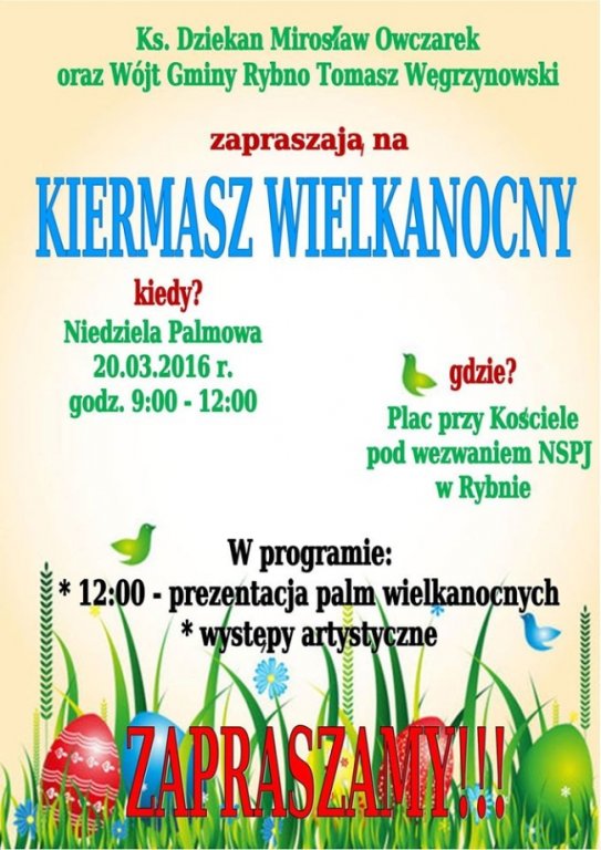 Zapraszamy na Kiermasz Wielkanocny, który odbędzie się w Niedzielę Palmową (20.03.2016r.) na placu przed Kościołem Parafialnym Pod Wezwaniem Najświętszego Serca Pana Jezusa w Rybnie.
