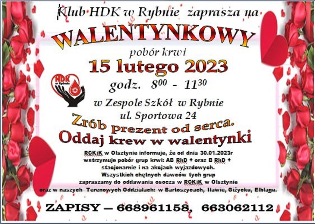 W środę, 15 lutego 2023r. w godz. 8:00-11:30 w Zespole Szkół w Rybnie odbędzie się kolejny pobór krwi organizowany przez Klub Honorowych Dawców Krwi w Rybnie. Rejestracja telefoniczna: 668 961 158 lub 663 062 112.