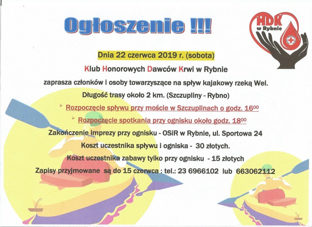 Klub Honorowych Dawców Krwi w Rybnie zaprasza członków i osoby towarzyszące na spływ kajakowy rzeką Wel.