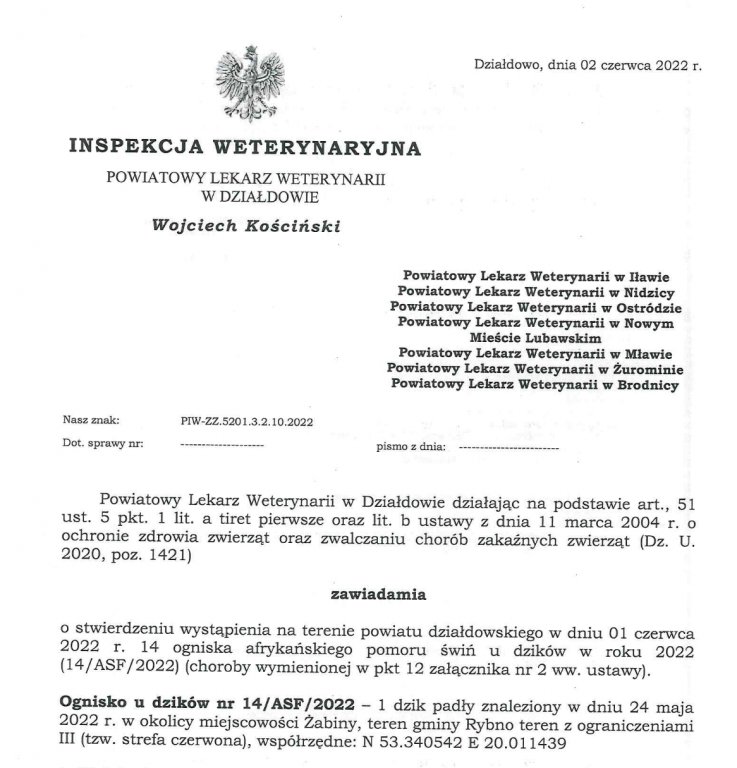 Powiatowy Lekarz Weterynarii w Działdowie zawiadamia o stwierdzeniu kolejnego ogniska afrykańskiego pomoru świń na terenie powiatu działdowskiego.