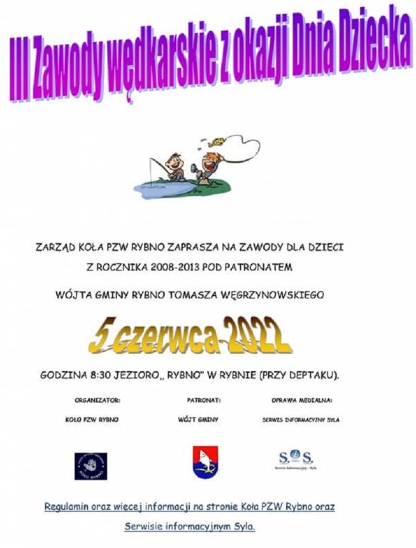 - W III spławikowych zawodach wędkarskich z okazji Dnia Dziecka startować mogą dzieci zameldowane w Gminie Rybno oraz Członkowie Koła PZW Rybno z rocznika 2008-2013.