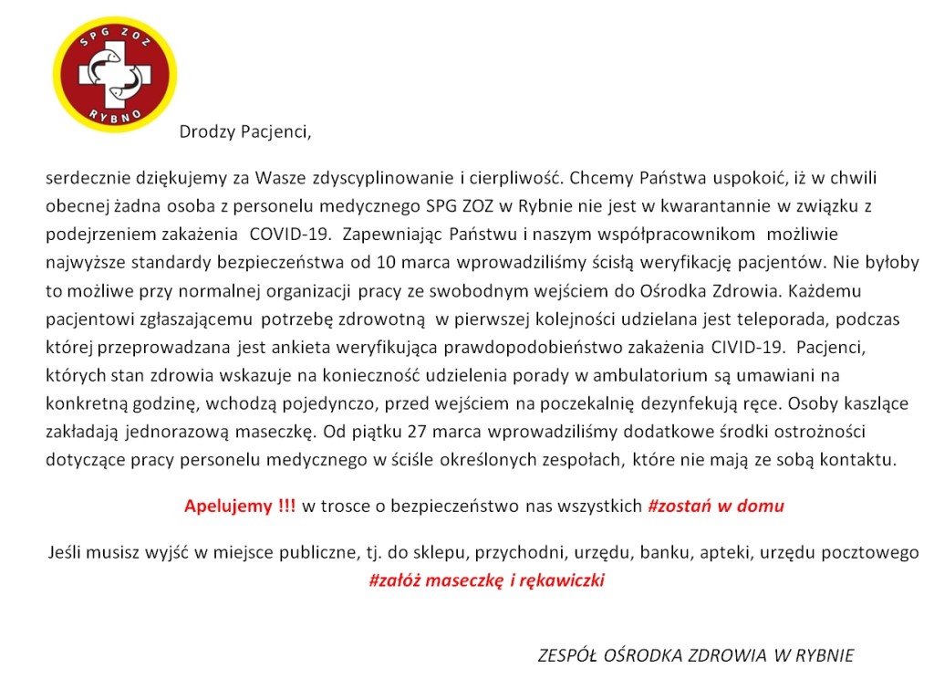 serdecznie dziękujemy za Wasze zdyscyplinowanie i cierpliwość. Chcemy Państwa uspokoić, iż w chwili obecnej żadna osoba z personelu medycznego SPG ZOZ w Rybnie nie jest w kwarantannie w związku z podejrzeniem zakażenia COVID-19. Zapewniając Państwu i naszym współpracownikom możliwie najwyższe standardy bezpieczeństwa od 10 marca wprowadziliśmy ścisłą weryfikację pacjentów. Nie byłoby to możliwe przy normalnej organizacji pracy ze swobodnym wejściem do Ośrodka Zdrowia. Każdemu pacjentowi zgłaszającemu potrzebę zdrowotną w pierwszej kolejności udzielana jest teleporada, podczas której przeprowadzana jest ankieta weryfikująca prawdopodobieństwo zakażenia CIVID-19. Pacjenci, których stan zdrowia wskazuje na konieczność udzielenia porady w ambulatorium są umawiani na konkretną godzinę, wchodzą pojedynczo, przed wejściem na poczekalnię dezynfekują ręce. Osoby kaszlące zakładają jednorazową maseczkę. Od piątku 27 marca wprowadziliśmy dodatkowe środki ostrożności dotyczące pracy personelu medycznego w ściśle określonych zespołach, które nie mają ze sobą kontaktu.