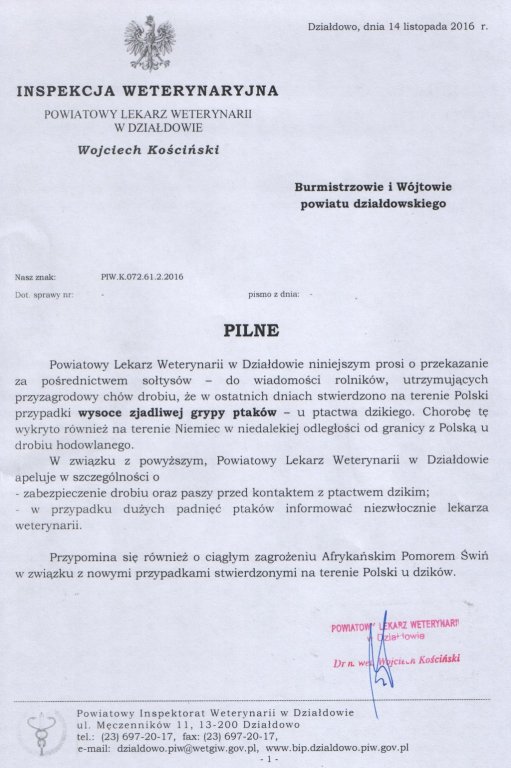 Komunikat Powiatowego Lekarza Weterynarii o stwierdzeniu na terenie Polski wysoce zjadliwej grypy ptaków u ptactwa dzikiego.