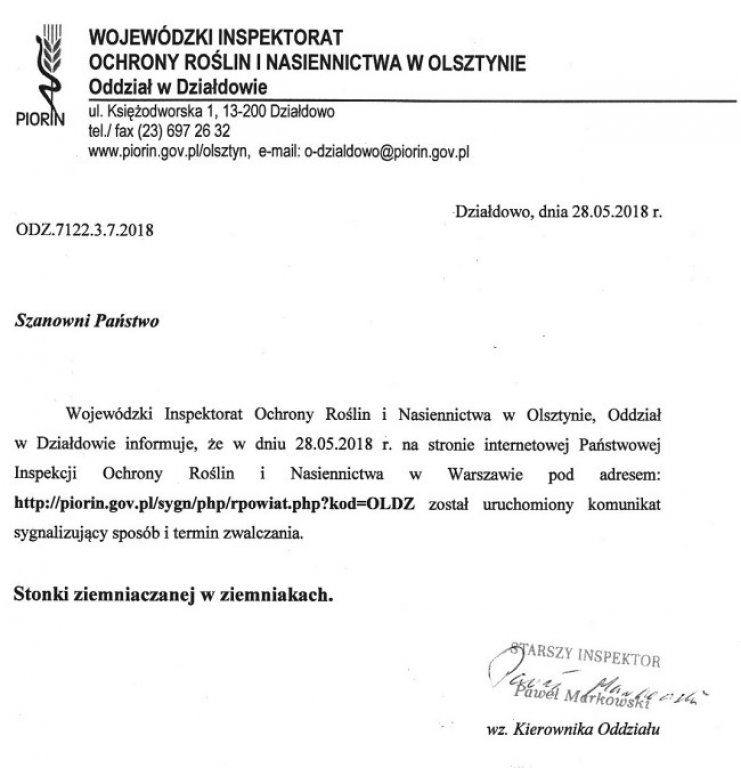 Wojewódzki Inspektorat Ochrony Roślin i Nasiennictwa w Olsztynie, Oddział w Działdowie informuje, że w dniu 28.05.2018 r. na stronie internetowej Państwowej Inspekcji Ochrony Roślin i Nasiennictwa w Warszawie został uruchomiony komunikat sygnalizujący sposób i termin zwalczania stonki ziemniaczanej w ziemniakach.