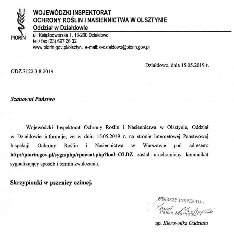 Komunikat sygnalizacyjny o sposobie i terminie zwalczania skrzypionki w pszenicy ozimej.