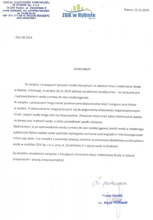 W związku z trwającymi pracami modernizacyjnymi w obiekcie Stacji Uzdatniania Wody w Rybnie, informuję, iż od dnia 18.11.2019 planuje się dokonać przełączenia — co związane jest z wprowadzeniem wody surowej do sieci wodociągowej.