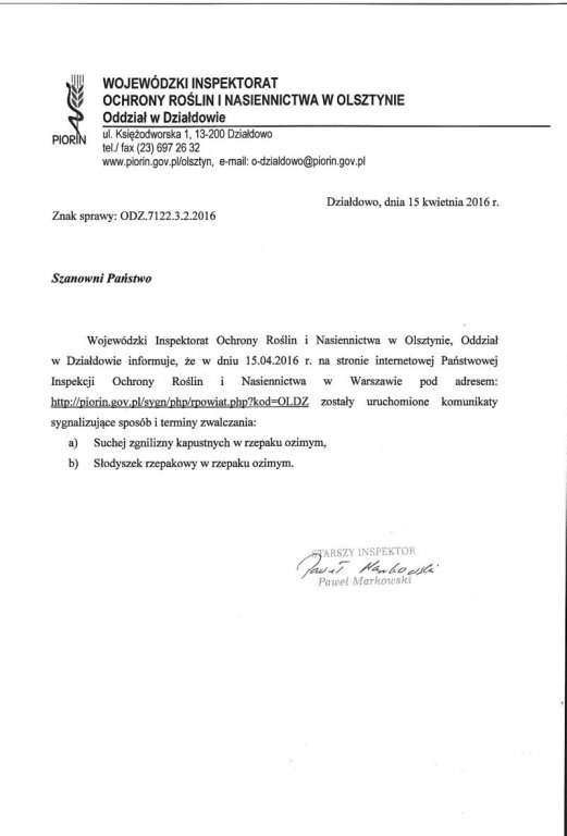 Wojewódzki Inspektorat Ochrony Roślin i Nasiennictwa w Olsztynie, Oddział w Działdowie informuje, że w dniu 15.04.2016 r. na stronie internetowej Państwowej Inspekcji Ochrony Roślin i Nasiennictwa w Warszawie został uruchomiony komunikat sygnalizujący sposób i termin zwalczania suchej zgnilizny kapustnych w rzepaku ozimym i słodyszka rzepakowego w rzepaku ozimym.