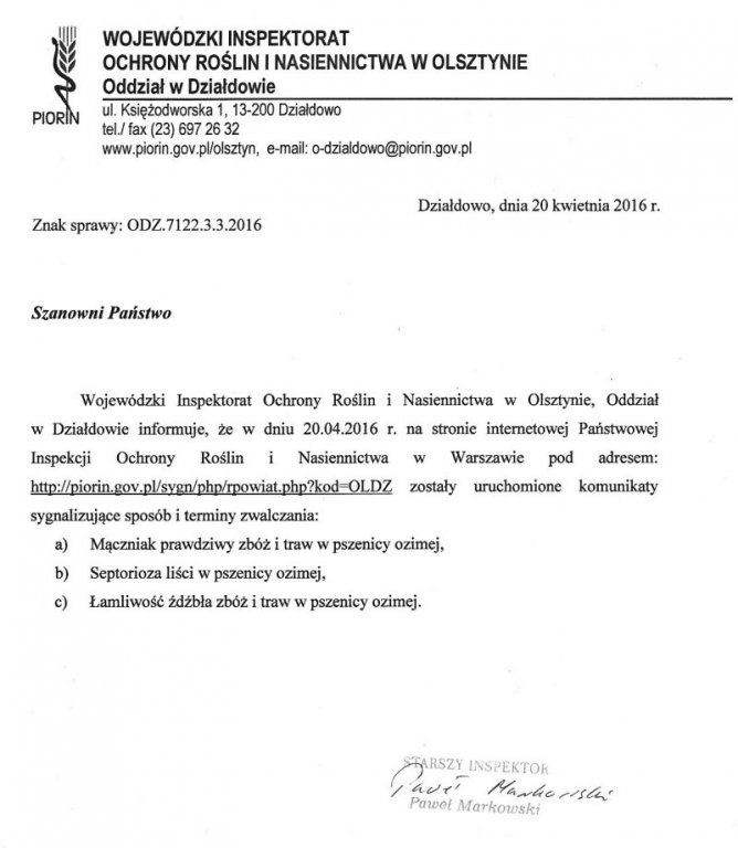Wojewódzki Inspektorat Ochrony Roślin i Nasiennictwa w Olsztynie, Oddział w Działdowie informuje, że w dniu 20.04.2016 r. na stronie internetowej Państwowej Inspekcji Ochrony Roślin i Nasiennictwa w Warszawie został uruchomiony komunikat sygnalizujący sposób i termin zwalczania mączniaka prawdziwego zbóż i traw, septoriozy liści i łamliwości źdźbła zbóż i traw w pszenicy ozimej.