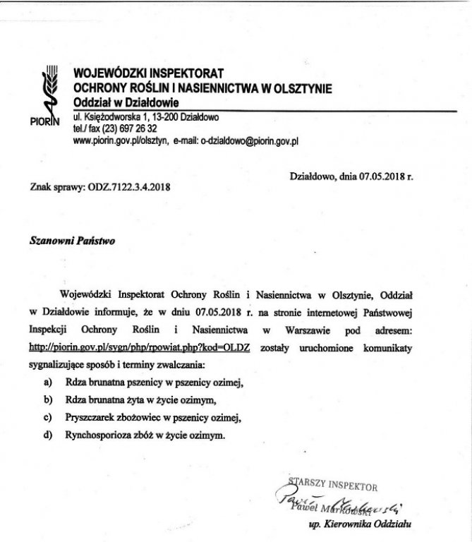 Wojewódzki Inspektorat Ochrony Roślin i Nasiennictwa w Olsztynie, Oddział w Działdowie informuje, że w dniu 07.05.2018 r. na stronie internetowej Państwowej Inspekcji Ochrony Roślin i Nasiennictwa w Warszawie zostały uruchomione komunikaty sygnalizujące sposób i termin zwalczania: