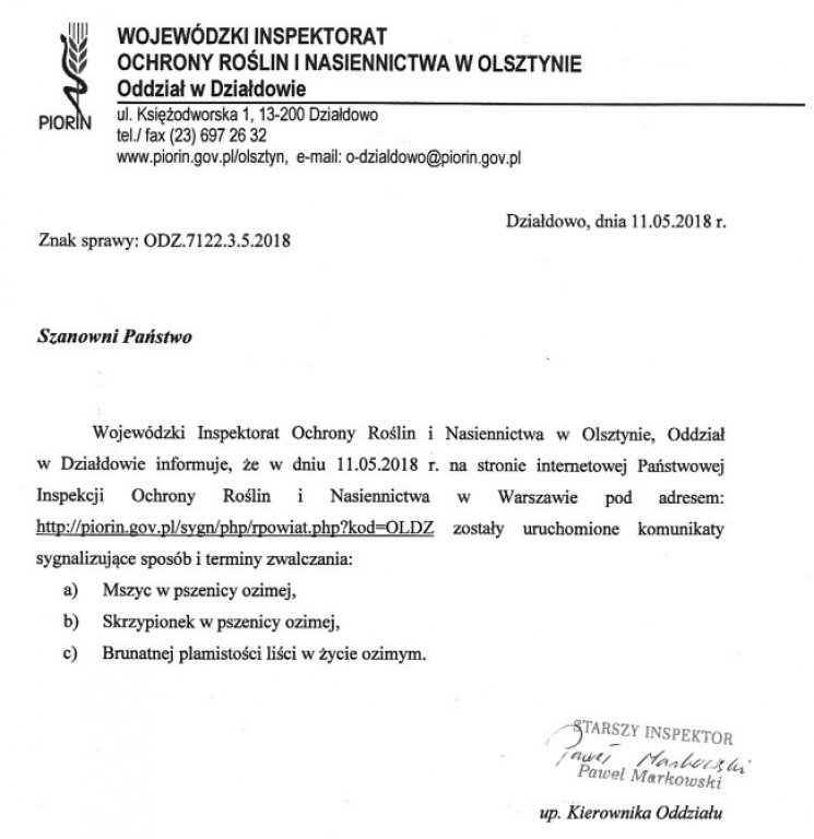 Wojewódzki Inspektorat Ochrony Roślin i Nasiennictwa w Olsztynie, Oddział w Działdowie informuje, że w dniu 11.05.2018 r. na stronie internetowej Państwowej Inspekcji Ochrony Roślin i Nasiennictwa w Warszawie zostały uruchomione komunikaty sygnalizujące sposób i termin zwalczania mszyc i skrzypionek w pszenicy ozimej oraz brunatnej plamistości liści w życie ozimym.