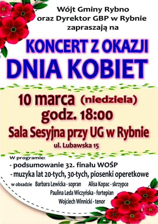 Wójt Gminy Rybno oraz Dyrektor Gminnej Biblioteki Publicznej w Rybnie zapraszają na koncert z okazji Dnia Kobiet, który odbędzie się w niedzielę 10 marca o godz. 18:00 w Sali sesyjnej przy Urzędzie Gminy w Rybnie.