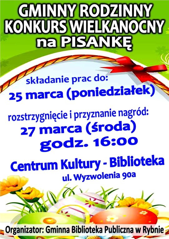 Gminna Biblioteka Publiczna w Rybnie organizuje Rodzinny Konkurs Wielkanocny na pisankę.